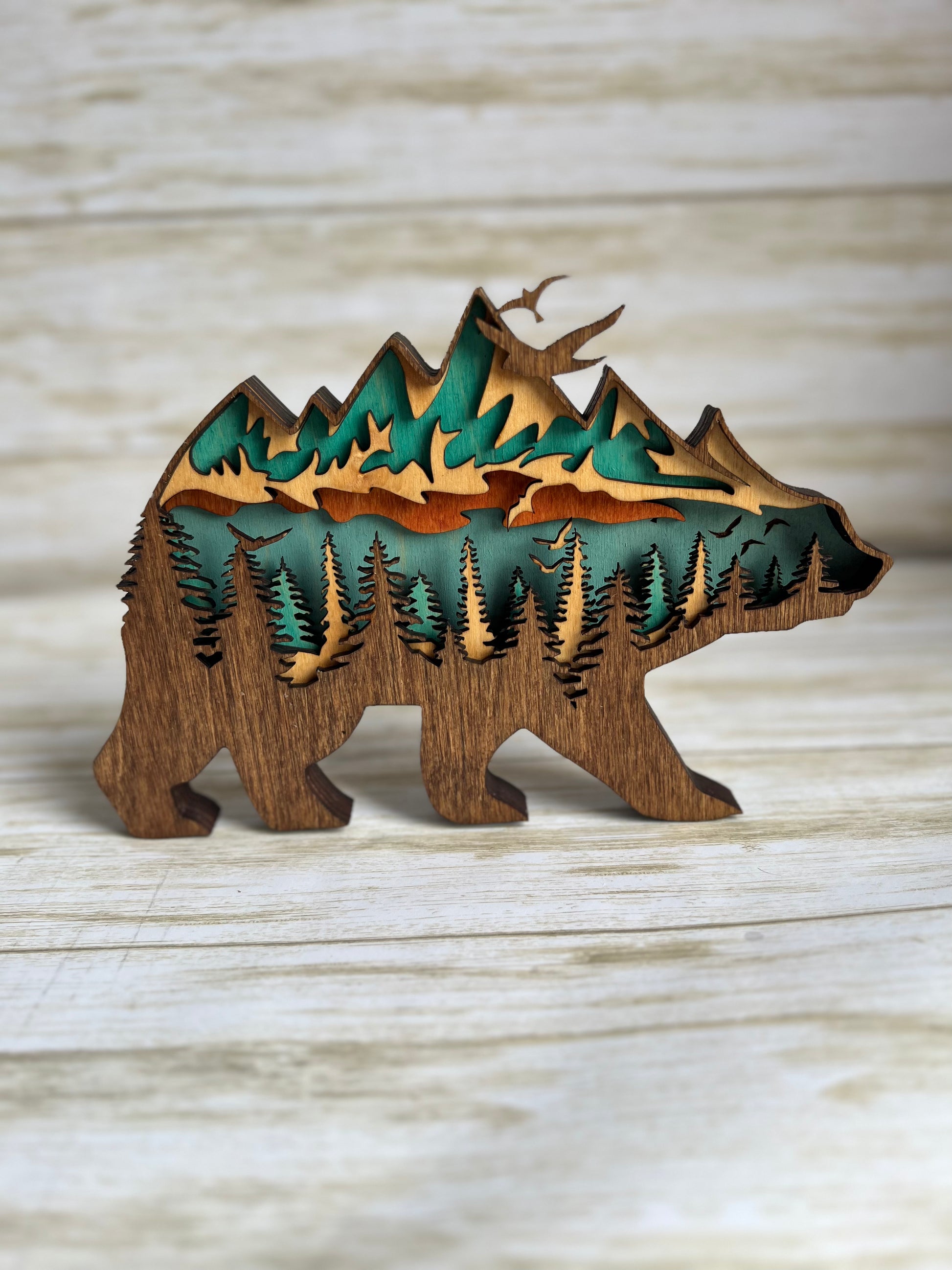 Bring a rustic mountain feel to your home with this beautiful Bear Layered Wood Shelf Sitter Wall Decor. Crafted from natural wood and layered to give the piece a 3D effect, this wall decor will bring a touch of the outdoors into any room. Let the mountains inspire you with this unique and beautiful piece!